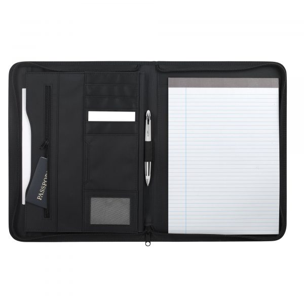 This sturdy vinyl padfolio has a textured finish and stitched details to give it a premium look. The interior organizer has lots of options for keeping students essentials together, and you can zip the whole thing shut to keep everything secure as you rush off to your next appointment.
