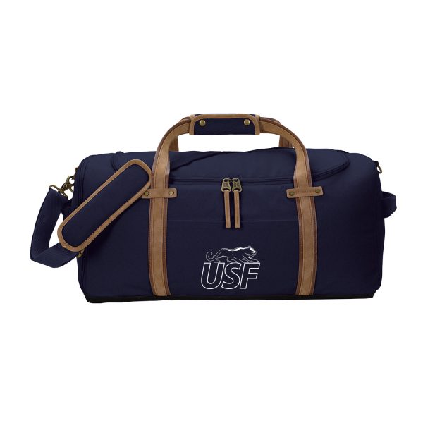 Pack in style for your next vacation. This premium cotton duffel has added details like striped interior lining and PU and suede carry handles for added sophistication.