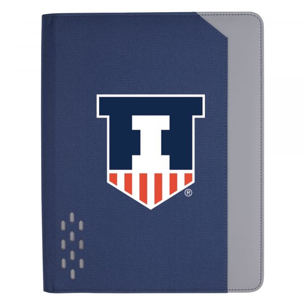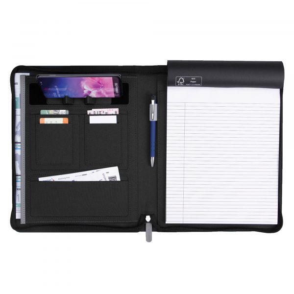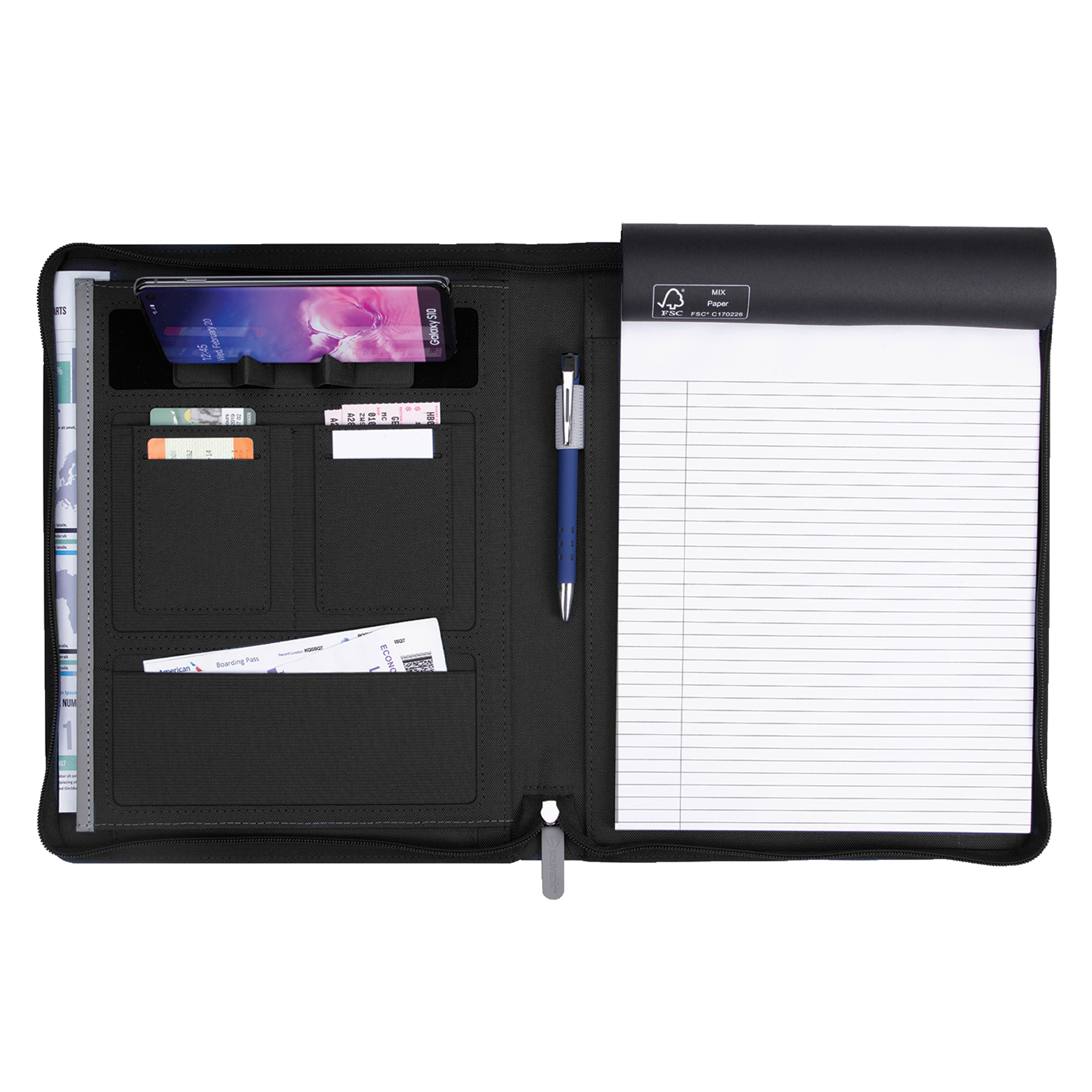 With sleek graphical cut-outs on its two-tone cover design, you might be surprised to discover all the features this zippered padfolio offers to keep you organized throughout a busy day. Inside, you’ll find a document pocket, business card slots, and a non-imprinted Souvenir® Armor Pen inserted into the pen loop. The 50-sheet FSC®-certified lined writing pad provides plenty of room for jotting notes, and the built-in phone/tablet stand keeps technology close by.